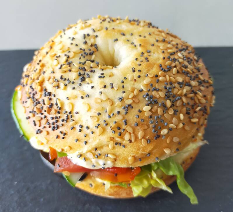 (blanc de poulet marinés, salade, tomates, oignons blancs, fromage Leerdameer, fromage frais)