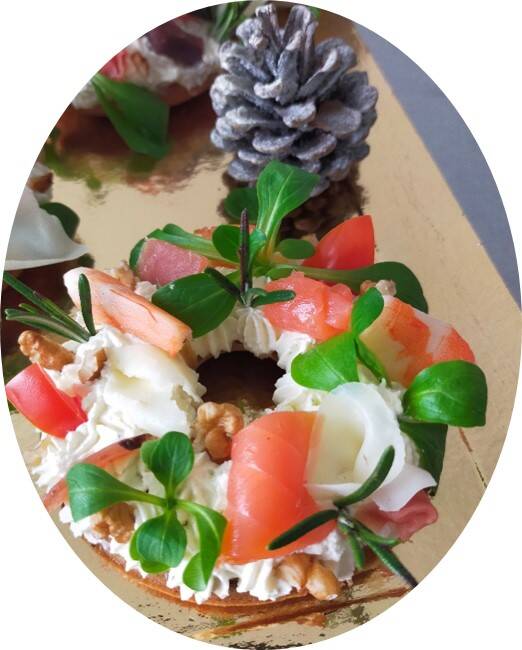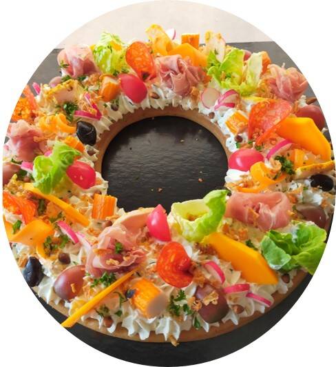 Couronne fraîcheur: (petit pois, tomates, œufs dur, crevettes, surimi, avocat, mayonnaise, gelée)