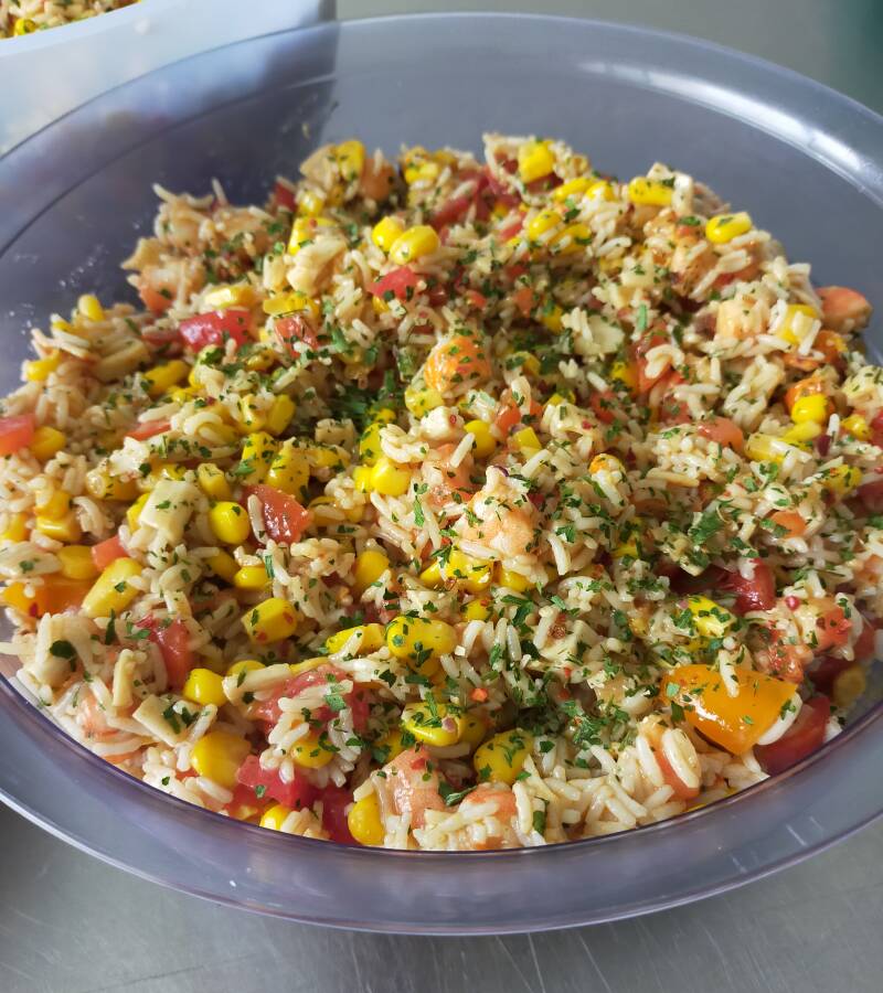 Riz, tomates cerises, maïs, poivrons rouges, crevettes, surimi, vinaigrette.