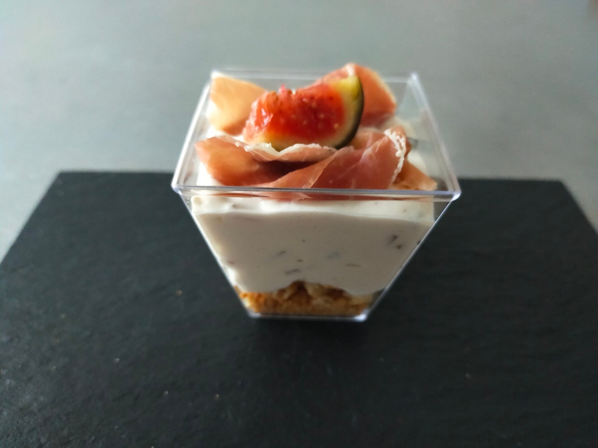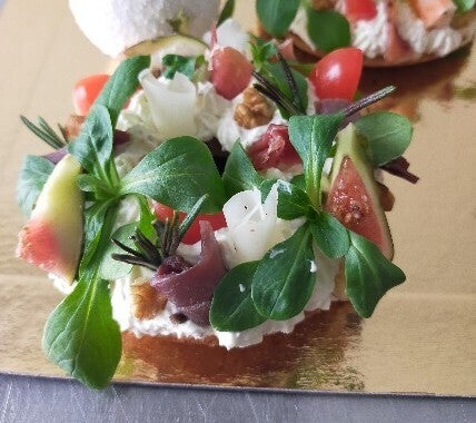 Pain d’épices, crème fouettée figues noix, jambon cru, magret de canard séchés, figues fraîches, roquette
