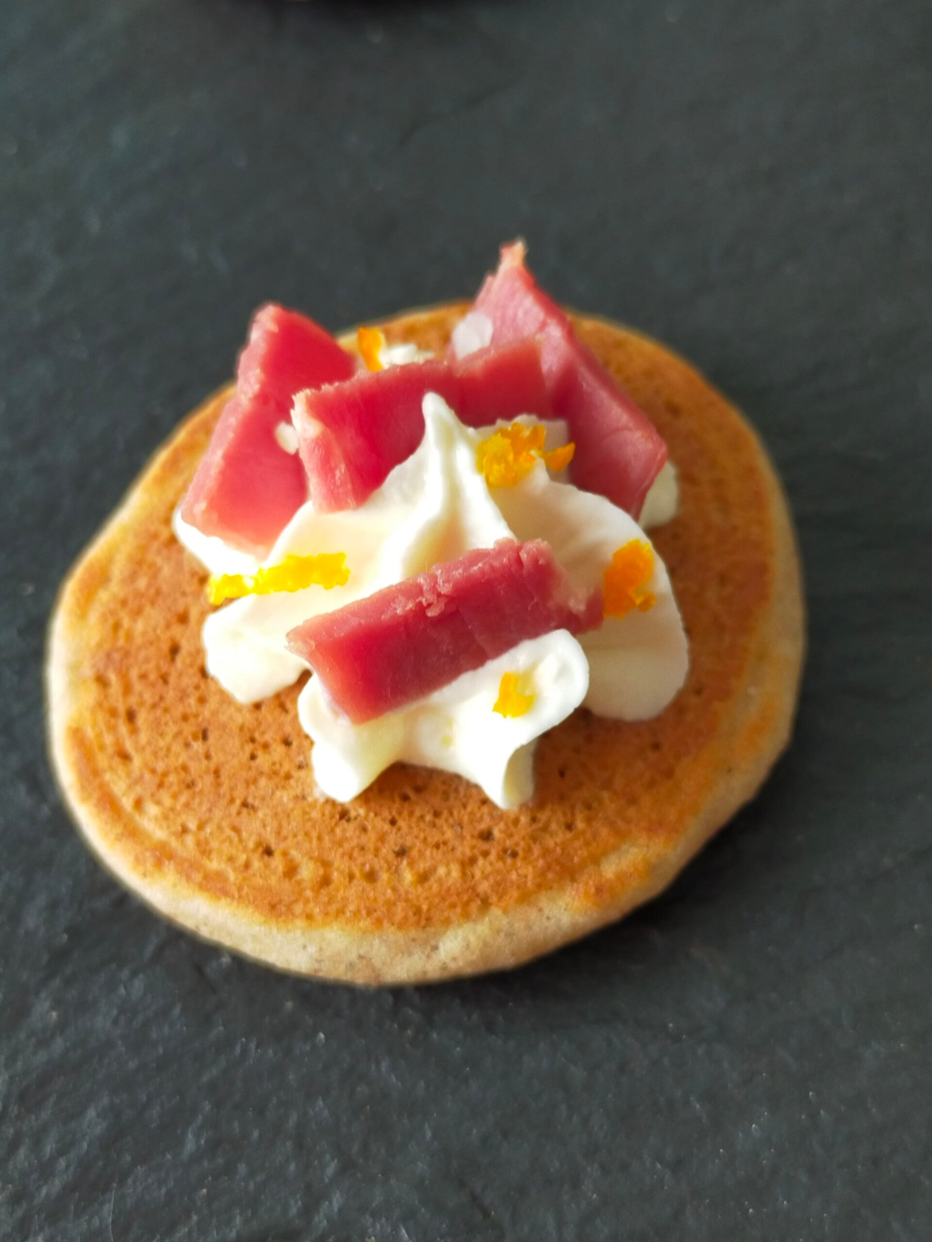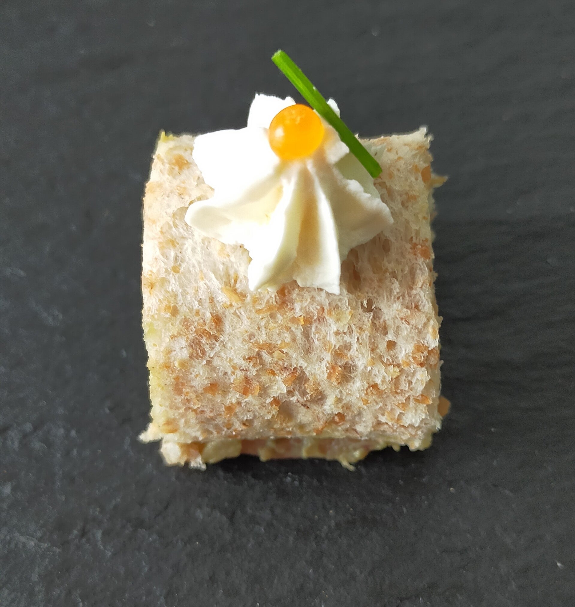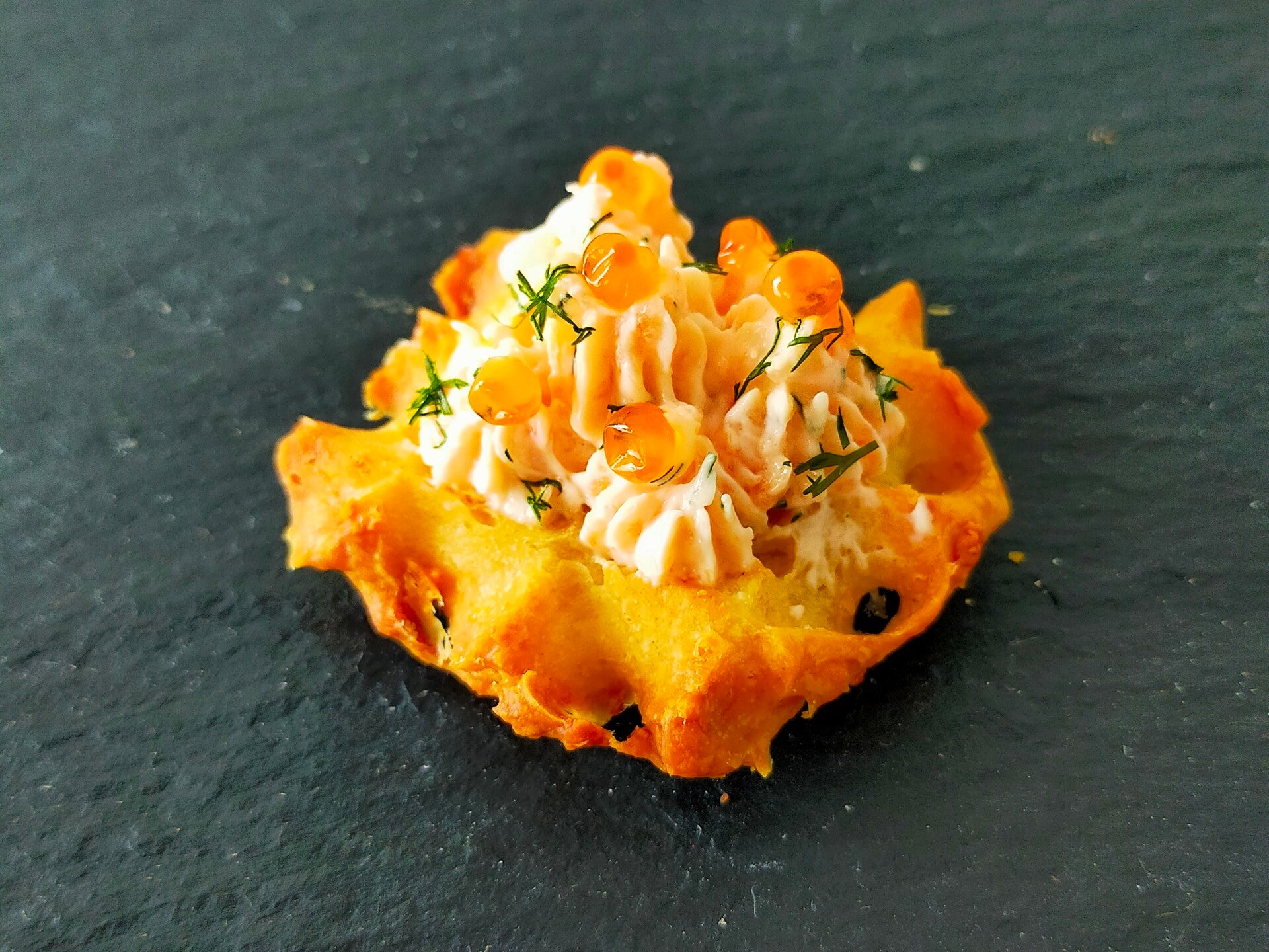 Mini gaufrette croustillante, crème de truite, aneth, œuf de truite
