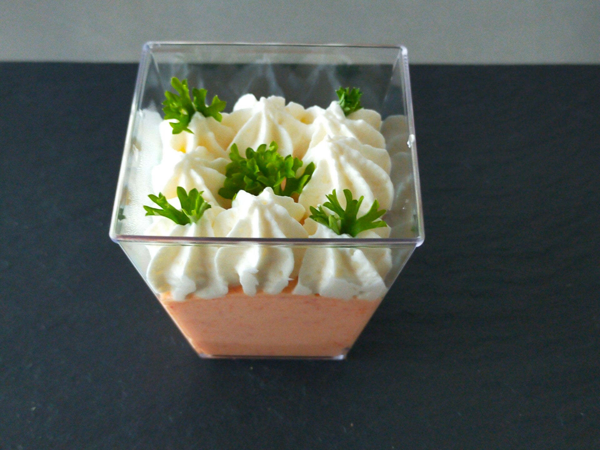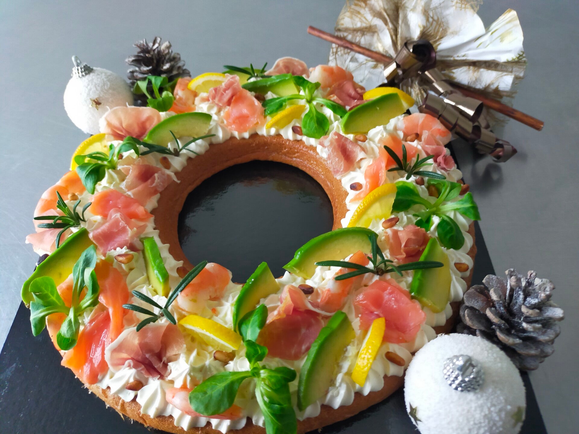 Biscuit moelleux aux noix, crème fouettée, saumon fumé, crevettes, avocat, mâche, jambon cru